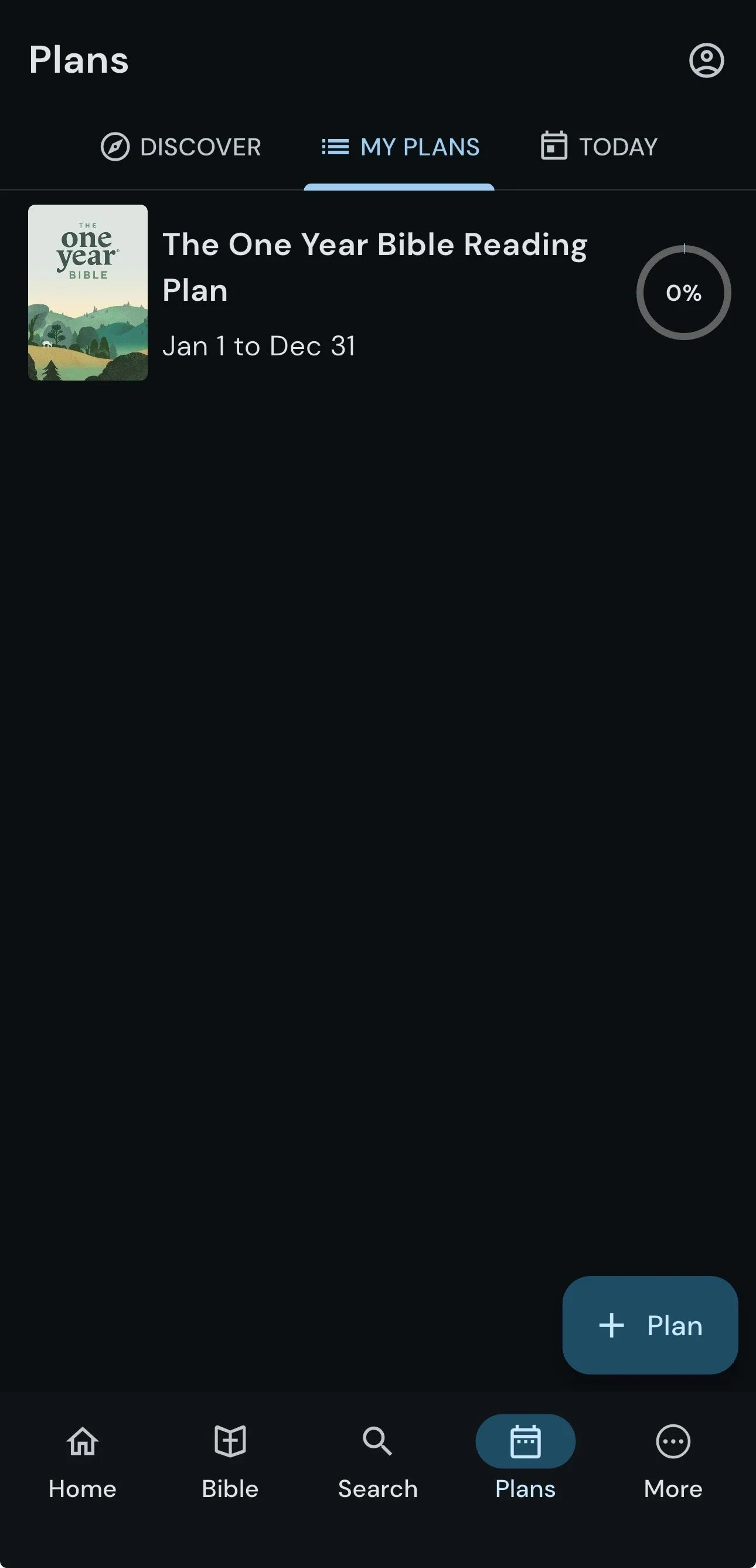 If you are reading this on January 1, 2026, then by all means feel free to use the YouVersion Bible app. (There is a MAJOR problem with the YouVersion app, however—see more, below.) Search for “One Year Bible” in Plans. It will look like this: