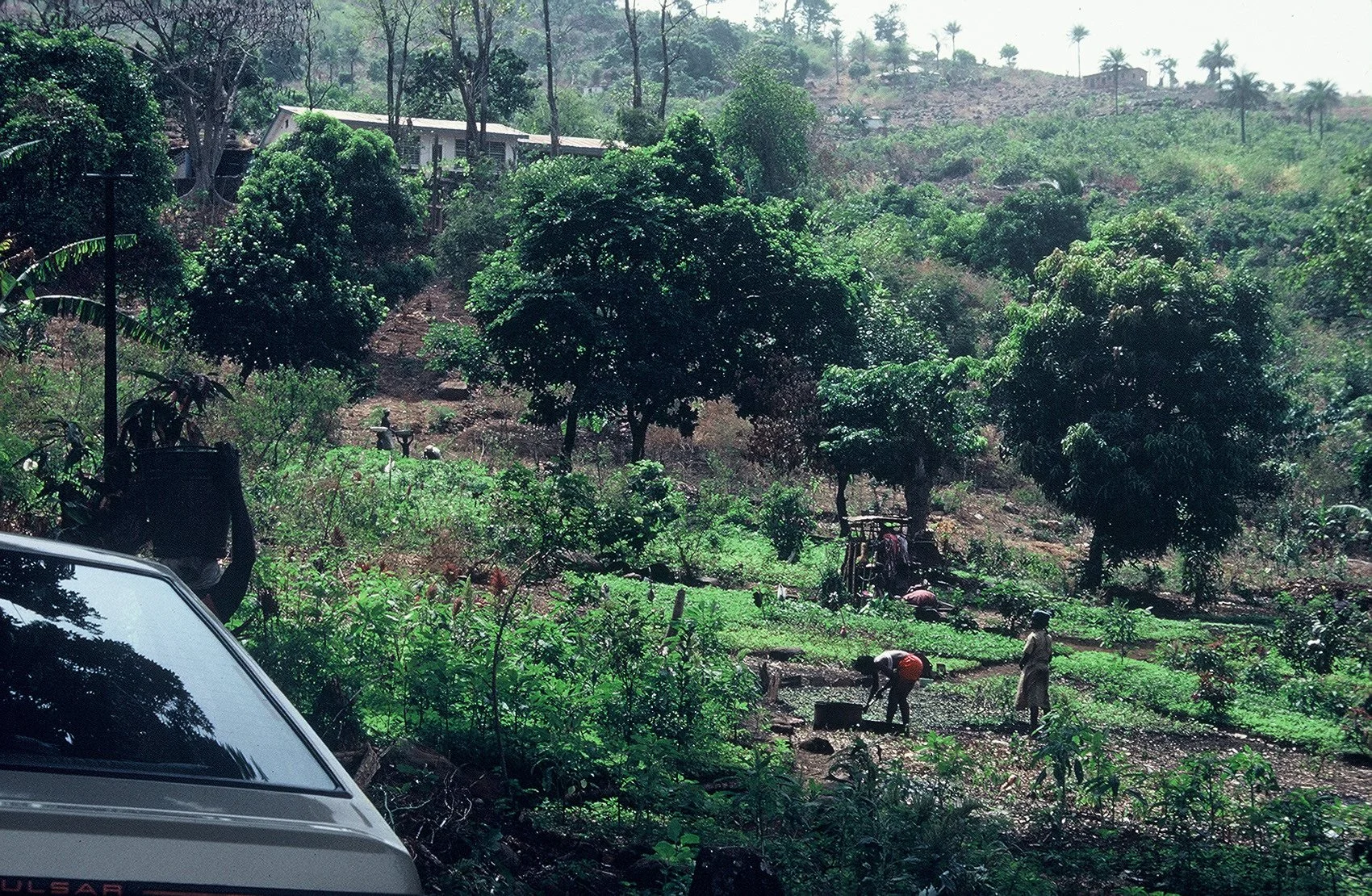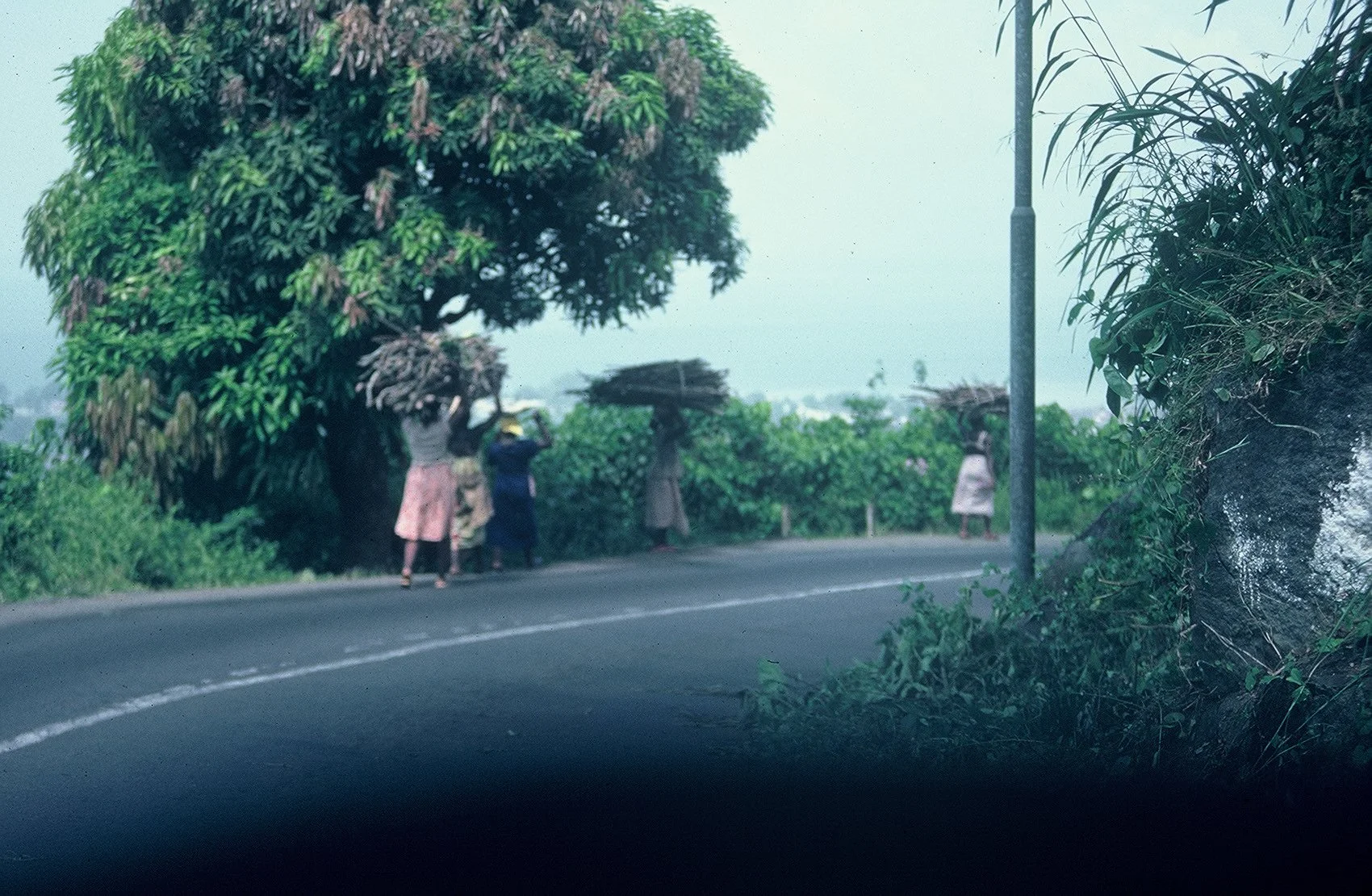 Sierra Leonean women carry their burdens on their heads. In the second photo above, you can see the women carrying bundles of firewood, with which they will make charcoal. I’m pretty sure that leafy tree on the left of the photo is a mango tree, though it’s hard to tell.